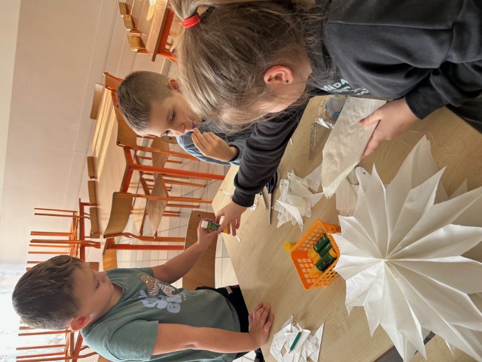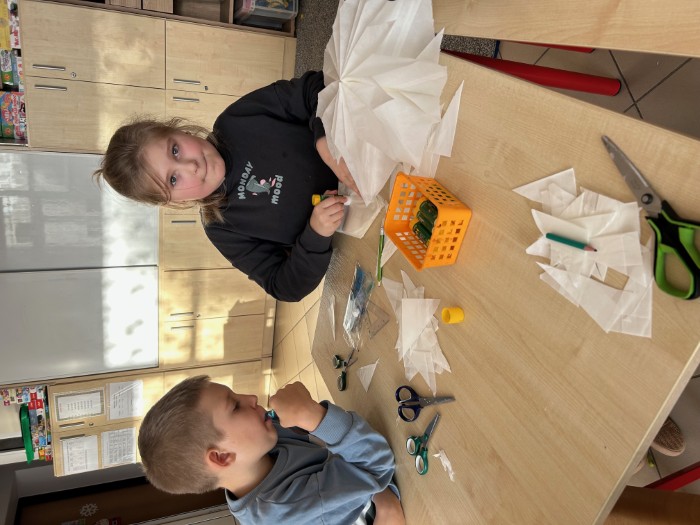 Gdy zbliżają się Święta, nasza świetlica zamienia się w pracownię Elfów! 🎅 Mali twórcy z zaangażowaniem wycinali i kleili, a efektem ich pracy są te oto przestrzenne gwiazdy. Duma z efektu końcowego – gwarantowana! ✨ Zobaczcie, jak powstawały te małe dzieła sztuki. 🌟
