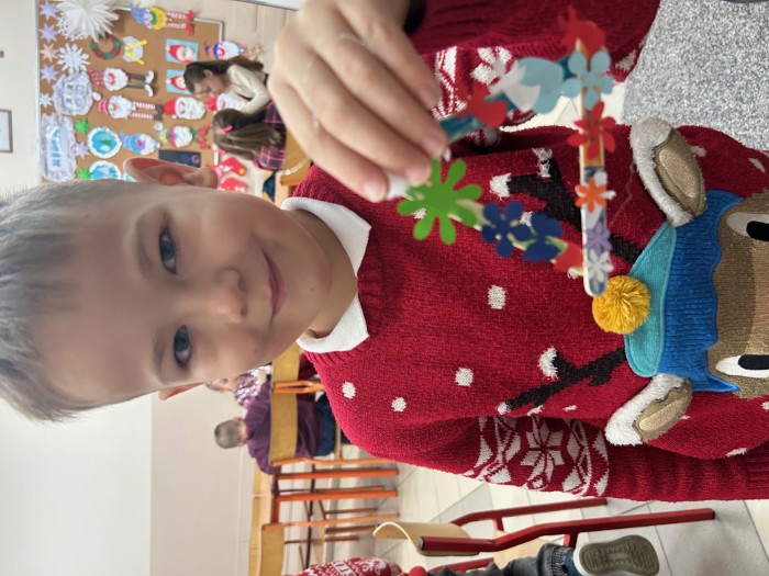 Głównymi bohaterami zajęć były kolorowe choinki oraz uśmiechnięte bałwanki. Dzieci z dużym zaangażowaniem ozdabiały je według własnych pomysłów. Na choinkach „zaświeciły” bombki z kolorowego papieru, natomiast bałwanki zyskały kolorowe czapki i nosy z papieru.
